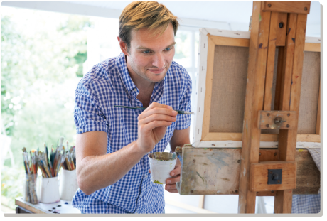 Pinsel, Farben und Leinwand gehören zu seinem „friedlichen“ Handwerkszeug. Herr M. T. ist zufrieden: Er kann seinen Beruf weiterhin ausüben, wenn auch mit gewissen Einschränkungen. Als Selbstständiger ist er häufig gefordert,